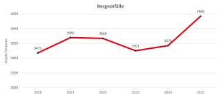 Fast 4000 Personen wurden im vergangenen Jahr in den Gebirgen der Schweiz gerettet. Das bedeutet einen Anstieg von 11 Prozent gegenüber dem Durchschnitt der Jahre 2020 bis 2024. Waren die Bedingungen im Jahr 2025 besonders gefährlich? Nicht unbedingt. Der mögliche Grund: "2025 waren wahrscheinlich besonders viele Menschen in den Bergen unterwegs. Darauf deuten unter anderem rekordhohe Zahlen bei den Hüttenübernachtungen hin", erläutert der SAC.