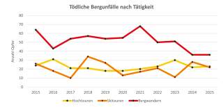 Deutlich niedriger ist hingegen die Zahl der tödlichen Unfälle: 2025 verunfallten beim Bergsport 98 Personen tödlich. "Das ist der tiefste Wert der letzten zehn Jahre", so der SAC. Zwischen 2015 und 2024 lag der Durchschnitt bei 119 Todesfällen pro Jahr. Die meisten tödlichen Unfälle passierten beim Bergwandern - wobei auch vergleichsweise sehr viele Menschen diese Bergsportart ausüben. Auch die meisten Rettungseinsätze gab es beim Bergwandern, sie machen fast die Hälfte (46 Prozent) aus, gefolgt von Skitouren und Hochtouren mit je 14 Prozent.