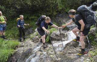 Und doch kann einen nichts darauf vorbereiten, das erste Mal im Leben vor einem vierhundert Meter hohen Aufstieg voller Geröllschutt zu stehen, aus dem Eisentritte herausragen. „Es hat wahnsinnig viele Ketten drin, da könnt ihr euch überall gut festhalten“, beruhigt Hannes ein paar blank liegende Nerven, dann teilt er die Gruppe auf. Die Stärkeren steigen mit Wanderführerin Kirstin Rütschle vor, den Rest der Gruppe nehmen Hannes und seine Frau Renate in ihre Mitte. Schritt für Schritt arbeiten sie sich hoch. Langsam, vorsichtig, doch immer stetig. Bejubelt werden sie von jenen, die bereits auf dem Sattel angekommen sind, das Pfeifen des Windes im Ohr, wild flatternde Tibet-Flaggen über den Köpfen. Als schließlich alle oben stehen auf dem kleinen felsigen Plateau, fallen sie einander in die Arme, so manche Träne fließt. „Wir schaffen das gemeinsam“: Das alte Bergsteigermotto, dass eine Gruppe exakt so schnell ist wie ihr langsamstes Mitglied und man sich gegenseitig hilft, wird hier gelebt.