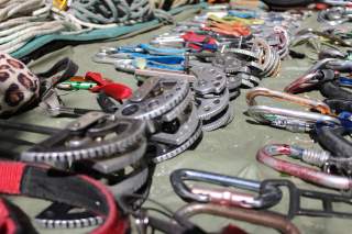 Expressschlingen, Bandschlingen, Schraub- und Einfachkarabiner, Reepschnüre und mobile Sicherungen wie beispielsweise Friends und Klemmkeile