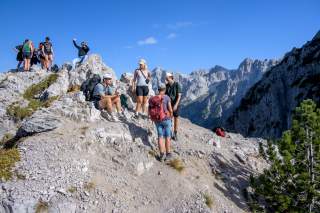 Manchmal luftig, aber immer gut gangbar, schlängelt sich der Pfad kühn zum Pejes-Pass hinauf. Die kleine Wiese mit dem Holzkreuz dort bietet das letzte Grün beim Aufstieg, denn nun ist der wasserlose Kalkkarst erreicht, der den Gipfelaufbau bestimmt. Über Hunderte Höhenmeter ist weglose Kraxelei durch Rinnen, über Geröllfelder, an Aufschwüngen und in scharfkantigen Wasserrillen angesagt. Nur ein paar Steintürmchen weisen den Weg. Der Lohn der mehrstündigen Mühe: Die Aussicht über die gesamten „verdammten Berge“ bis hinüber ins Nachbarland Montenegro.