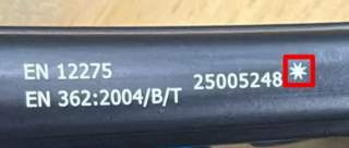 Bereits geprüfte Karabiner, die mithin nicht vom Rückruf betroffen sind, weisen rechts oberhalb der Chargennummer eine Markierung auf in Form eines achtzackigen Sternes.