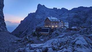 Der Sommerstein (2308 m) ist der Hausberg des Riemannhauses. Es gibt deutlich höhere Berge im Steinernen Meer. Dennoch ist diese Berggestalt eine der markantesten weit und breit. Durch die steile Südwand führen kühne Kletterrouten. Ein kurzer Steig leitet hingegen in wenigen Minuten von der Hütte hinauf zum Gipfel. Ein perfektes Ziel also für den Sonnenuntergang. Herrlich ist der Blick über den Zeller See hinweg auf den Alpenhauptkamm mit Großem Wiesbachhorn, Großglockner und Großvenediger. In der Hütte sind derweil schon die Lichter angegangen. Die abendlichen Diskussionen kreisen um Fotografie und Hydrauliksysteme, von Niveaulosigkeit weiterhin keine Spur. Dafür stimmt die Chemie in unserer kleinen Gruppe und wir freuen uns auf die Königsetappe zur Schönfeldspitze.