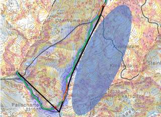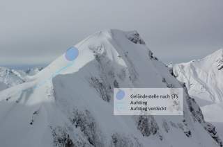 45 Prozent der potenziell lawinengefährlichen Geländestellen, die durch den ersten Filter (30°-Methode) der STS aufgedeckt werden, sind im STG als Schlüsselstellen markiert. Dabei werden besonders Auslaufbereiche vom STG deutlich seltener als Schlüsselstellen ausgewiesen (nur 29 Prozent). Entscheidend ist aber, dass der STG bei entsprechender Lawinensituation auch an lawinengefährlichen Routenpassagen außerhalb der Schlüsselstellen ein erhöhtes Risiko ausgibt. Grundsätzlich zeigte sich hier eine hohe Übereinstimmung zwischen den Risikoeinschätzungen von STS und STG. Wir fanden keine Unterschiede in den Übereinstimmungen der Risikoeinschätzungen für Auslaufbereiche versus direkte Geländestellen und auch nicht für Gleit- und Nassschnee versus trockene Schneebrettlawinen. Für ein Planungstool ist es jedoch zentral, dass es keine riskanten Geländestellen übersieht. Hierzu untersuchten wir, ob STG ein erhöhtes Risiko (orange, rot) an den 44 Stellen anzeigt, die seitens der Risikoanalyse der STS als deutliche Gefahrenstellen eingestuft waren. Bei acht dieser Stellen gab STG ein „niedriges“ Risiko (grün) an – eine dieser Stellen beschreiben wir unten. Unterm Strich: Unsere Untersuchungen legen nahe, dass bei einer Tourenplanung mit dem STG Gefahrenstellen nicht systematisch übersehen werden. Das Risiko wird auch bei Auslaufbereichen sowie Stellen mit Gleit- oder Nassschneeproblem nicht unterschätzt.