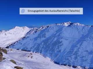 Es handelt sich um einen Auslaufbereich eines (nord-)westseitigen Einzugsgebiets mit einer oberen Hanghöhe von 2200 Metern, einer Hangdimension von 250 Metern, einer Steilheit von 40°+, im Anrissbereich ist der Hang teilweise felsdurchsetzt. Grundsätzlich ist der ganze Talgrund von der großen Flanke bedroht (siehe Foto; der gesamte abgebildete Hang stellt das Einzugsgebiet dar). Es herrscht Lawinengefahrenstufe 3 mit einem Neuschneeproblem oberhalb der Waldgrenze, einem Gleitschneeproblem unterhalb von 2400 Metern und der Möglichkeit von Nassschneerutschen im Tagesverlauf (s. Lawinen.report). Das Expertenteam sieht das Neuschneeproblem nicht mehr als deutlich vorliegend, sondern kann eine Setzung der Schneedecke beobachten. Damit geht es davon aus, dass eine Selbstauslösung des Neuschnees nicht mehr zu erwarten ist. Der Einzugsbereich liegt in Bezug auf das Gleitschneeproblem nicht in der Kernzone, der Untergrund des Einzugsbereichs spricht gegen Gleitschneebedingungen. Durchfeuchtung und Lockerschneelawinen seien erst später am Tag zu erwarten, eine Passage des Auslaufbereichs im Gruppenverband ist demnach vertretbar. Aufgrund der ganztägig ausgegebenen Gefahrenstufe 3 kommt der Skitourenguru auf ein verhältnismäßig hohes Auslösungsrisiko.
