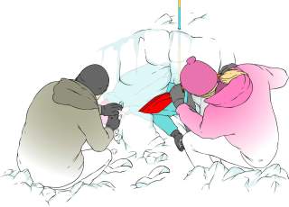 Die Zahlen unterstreichen, wie wichtig eine effiziente Kameradenrettung ist, da innerhalb von zehn Minuten keine organisierte Bergrettung das Lawinenfeld auch nur betreten kann. Die Ortung mit Lawinenverschüttetensuchgerät und Sonde und das „grobe, schnelle“ Ausschaufeln ist ein eigenes Thema, detaillierte Infos gibt es auf alpenverein.de. Die nächsten Schritte, nachdem einzelne Körperteile freigelegt wurden: das Tempo beim Ausschaufeln etwas drosseln und nun behutsamer vorgehen – mit den Händen statt der Schaufel – um dennoch möglichst rasch, aber sorgsam zum Kopf der verschütteten Person vorzustoßen und deren Atemwege freizulegen.