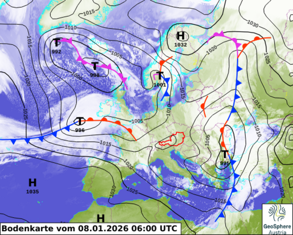 Am Sonntag klingen anfängliche Schneefälle von der Dauphiné bis zum Schweizer Alpennordhang ab und die Wolken lockern auf. Überall sonst verläuft der Tag trocken und aufgelockert bewölkt. Auch der Wind lässt vorübergehend deutlich nach. Zum Montag sorgt die nächste Warmfront aus Westen für Niederschlag und einen Anstieg der Schneefallgrenze. Zuverlässigkeit der Prognose (hoch >80%, mittel 60-80%, tief <60%): hoch Letzte Aktualisierung durch den Wetterdienst der GeoSphere Austria, Regionalstelle Innsbruck: 07.01.2026 um 12:30:16 Uhr