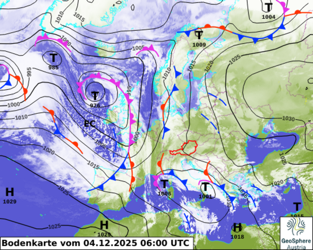 Die Nacht zum Freitag verläuft verbreitet trüb und bis in den Vormittag kann es vielerorts etwas regnen bzw. schneien, Schneefallgrenze meist um 800 m. Eher trocken von den Vogesen bis zum Rothaargebirge. Tagsüber werden die Niederschläge seltener, ziehen sich in Richtung Erzgebirge zurück. Auch wenn das dann meist niederschlagsfrei bleibt, sind kaum nennenswerte Auflockerungen zu erwarten und es bleibt nebelig-trüb. Die Temperaturen liegen in 800 m bei -1 bis +4 Grad, in 1200 m zwischen -1 und +2 Grad, der Wind weht schwach bis mäßig aus weiterhin meist westlichen Richtungen.Letzte Aktualisierung durch den Wetterdienst der GeoSphere Austria, Regionalstelle Innsbruck: 04.12.2025 um 12:53:22 Uhr