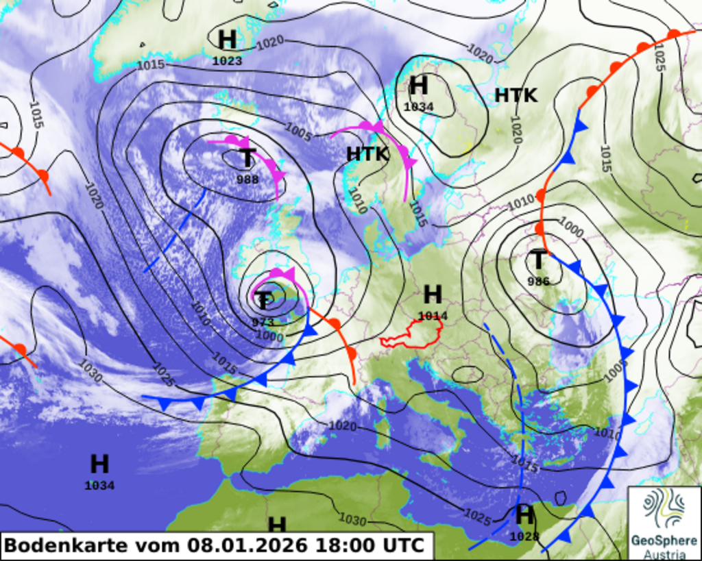 Am Freitag sorgt ein ausgeprägtes Sturmtief mit Kern bei der Nordsee vor allem in der Westhälfte für sehr windige und generell unbeständige Verhältnisse. Eine Warmfront bringt am Morgen im Erzgebirge noch letzte Schauer, diese Front zieht rasch ab. Am Vormittag sind dann mit dem starken Wind gebietsweise sonnige Auflockerungen möglich. Im Südwesten werden einige Plusgrade erreicht, im Nordosten bleibt es bei Dauerfrost. Länger trocken bleibt es von der Schwäbischen bis zur Fränkischen Alb, hier kann sich die Sonne am längsten halten. Ansonsten sind wiederholt Schauer zu erwarten, im Norden und Westen sogar recht häufig, die Temperaturen sinken tagsüber wieder. Temperatur: In 800 m von -7 bis 4 Grad, in 1000 m bis um 0 Grad, in 1200 m bis um -2 Grad, Nullgradgrenze: von 0 bis 1100 m. Wind in freien Lagen: In 800 m von 10 bis 80 km/h, in 1000 m von 40 bis 80 km/h, in 1200 m Sturm bis um 90 km/h im Mittel, Orkanböen bis um 140 km/h aus dem Sektor West. Neuschneesituation: von 1 bis 11 cm. Gewitterrisiko: Nordwestdeutsche Mittelgebirge: ganztags sehr gering, sonst vereinzelt möglich.Letzte Aktualisierung durch den Wetterdienst der GeoSphere Austria, Regionalstelle Innsbruck: 08.01.2026 um 13:47:11 Uhr