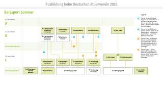 Im Bereich Bergsport Sommer bieten wir folgende Ausbildungsrichtungen für ehrenamtliche Multiplikator*innen an auf den Ebenen Vorstufenqualifikation, C und B