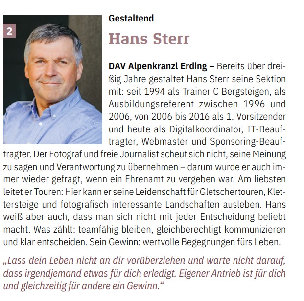Bereits über dreißig Jahre gestaltet Hans Sterr seine Sektion mit: seit 1994 als Trainer C Bergsteigen, als Ausbildungsreferent zwischen 1996 und 2006, von 2006 bis 2016 als 1. Vorsitzender und heute als Digitalkoordinator, IT-Beauftragter, Webmaster und Sponsoring-Beauftragter. Der Fotograf und freie Journalist scheut sich nicht, seine Meinung zu sagen und Verantwortung zu übernehmen – darum wurde er auch immer wieder gefragt, wenn ein Ehrenamt zu vergeben war. Am liebsten leitet er Touren: Hier kann er seine Leidenschaft für Gletschertouren, Klettersteige und fotografisch interessante Landschaften ausleben. Hans weiß aber auch, dass man sich nicht mit jeder Entscheidung beliebt macht. Was zählt: teamfähig bleiben, gleichberechtigt kommunizieren und klar entscheiden. Sein Gewinn: wertvolle Begegnungen fürs Leben.
