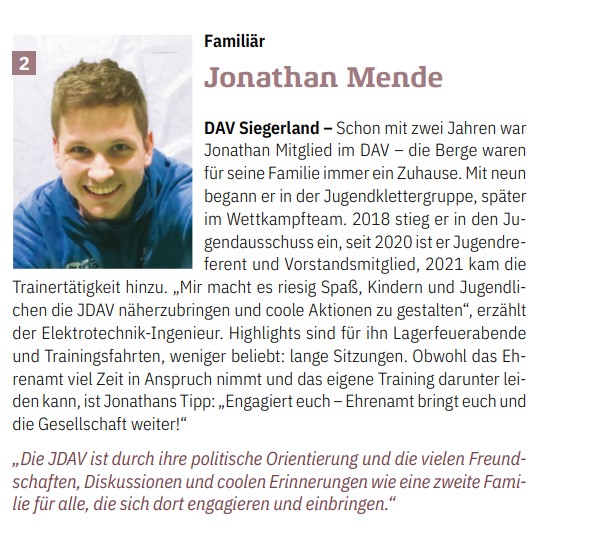 Schon mit zwei Jahren war Jonathan Mitglied im DAV – die Berge waren für seine Familie immer ein Zuhause. Mit neun begann er in der Jugendklettergruppe, später im Wettkampfteam. 2018 stieg er in den Jugendausschuss ein, seit 2020 ist er Jugendreferent und Vorstandsmitglied, 2021 kam die Trainertätigkeit hinzu. Highlights sind für den Elektrotechnik-Ingenieur Lagerfeuerabende und Trainingsfahrten.