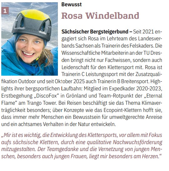 Seit 2021 engagiert sich Rosa im Lehrteam des Landesverbands Sachsen als Trainerin des Felskaders. Die Wissenschaftliche Mitarbeiterin an der TU Dresden bringt nicht nur Fachwissen, sondern auch Leidenschaft für den Klettersport mit. Rosa ist Trainerin C Leistungssport mit der Zusatzqualifikation Outdoor und seit Oktober 2025 auch Trainerin B Breitensport. Highlights ihrer bergsportlichen Laufbahn: Mitglied im Expedkader 2020-2023, Erstbegehung „DiscoFox“ in Grönland und Team-Rotpunkt der „Eternal Flame“ am Trango Tower. Bei Reisen beschäftigt sie das Thema Klimaverträglichkeit besonders; über Konzepte wie das Ecopoint-Klettern hofft sie, dass immer mehr Menschen ein Bewusstsein für umweltgerechte Anreise und ein achtsames Verhalten in der Natur entwickeln.