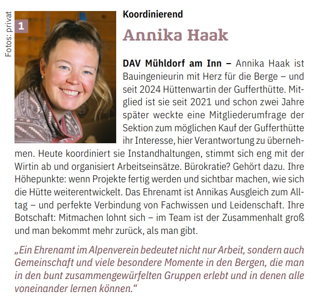 "Ein Ehrenamt im Alpenverein bedeutet nicht nur Arbeit, sondern auch Gemeinschaft und viele besondere Momente in den Bergen, die man in den bunt zusammengewürfelten Gruppen erlebt und in denen alle voneinander lernen können.“