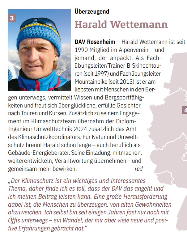 Harald Wettemann ist seit 1990 Mitglied im Alpenverein – und jemand, der anpackt. Als Fachübungsleiter/Trainer B Skihochtouren (seit 1997) und Fachübungsleiter Mountainbike (seit 2013) ist er am liebsten mit Menschen in den Bergen unterwegs, vermittelt Wissen und Bergsportfähigkeiten und freut sich über glückliche, erfüllte Gesichter nach Touren und Kursen. Zusätzlich zu seinem Engagement im Klimaschutzteam übernahm der Diplom-Ingenieur Umwelttechnik 2024 zusätzlich das Amt des Klimaschutzkoordinators. Für Natur und Umweltschutz brennt Harald schon lange – auch beruflich als Gebäude-Energieberater. Seine Einladung: mitmachen, weiterentwickeln, Verantwortung übernehmen – und gemeinsam mehr bewirken.