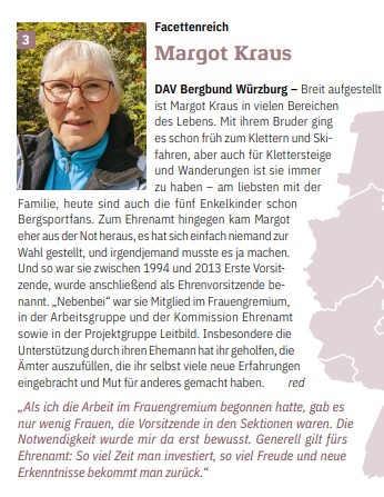 Breit aufgestellt ist Margot Kraus in vielen Bereichen des Lebens. Mit ihrem Bruder ging es schon früh zum Klettern und Skifahren, aber auch für Klettersteige und Wanderungen ist sie immer zu haben – am liebsten mit der Familie, heute sind auch die fünf Enkelkinder schon Bergsportfans. Zum Ehrenamt hingegen kam Margot eher aus der Not heraus, es hat sich einfach niemand zur Wahl gestellt, und irgendjemand musste es ja machen. Und so war sie zwischen 1994 und 2013 Erste Vorsitzende, wurde anschließend als Ehrenvorsitzende benannt. „Nebenbei“ war sie Mitglied im Frauengremium, in der Arbeitsgruppe und der Kommission Ehrenamt sowie in der Projektgruppe Leitbild. Insbesondere die Unterstützung durch ihren Ehemann hat ihr geholfen, die Ämter auszufüllen, die ihr selbst viele neue Erfahrungen eingebracht und Mut für anderes gemacht haben.
