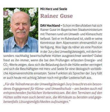 Schon im Berufsleben hat sich Rainer Guse im Bayerischen Staatsministerium mit Themen rund um Umwelt- und Klimaschutz befasst. Seit er im Ruhestand ist, stellt er seine Kenntnisse dem Alpenverein ehrenamtlich zur Verfügung. Was läge da näher als eine Position in der Jury des Umweltgütesiegels, mit dem besonders nachhaltig bewirtschaftete Hütten ausgezeichnet werden? Dabei freut es ihn immer, wenn die bei den Prüfungen erfassten Energie- und CO2 -Werte zeigen, dass sich die Belastung durch die Hütte weiter verringert und sich die Beschäftigten mit Herz und Seele für eine ökologisch vorbildliche Alpenvereinshütte einsetzen. Seine Funktion als Sprecher der Jury füllt er auch heute mit achtzig Jahren noch mit großer Leidenschaft aus.