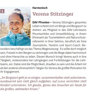 Verena Stitzingers gesamtes Leben scheint sich um Berge und Bergsport zu drehen: als Mitglied in den DAV-Lehrteams Mountainbike und Umweltbildung, in ihrem Ehrenamt als Tourenleiterin und Naturschutzreferentin in ihrer Sektion, beruflich als freie Journalistin, Texterin und Sport-Coach. Besonders beschäftigt sie das Thema Wegenutzung. Den Wunsch, die Wege während der Freizeit in den Bergen harmonisch und ohne Hierarchie zu teilen, bringt Verena auch in ihre Tätigkeit, insbesondere bei Lehrgängen und Fortbildungen für die Lehrteams, ein. Dabei sind die Möglichkeit, draußen zu sein und die Arbeit mit all den anderen ehrenamtlich Tätigen für Verena die größte Motivation für ihr Engagement.